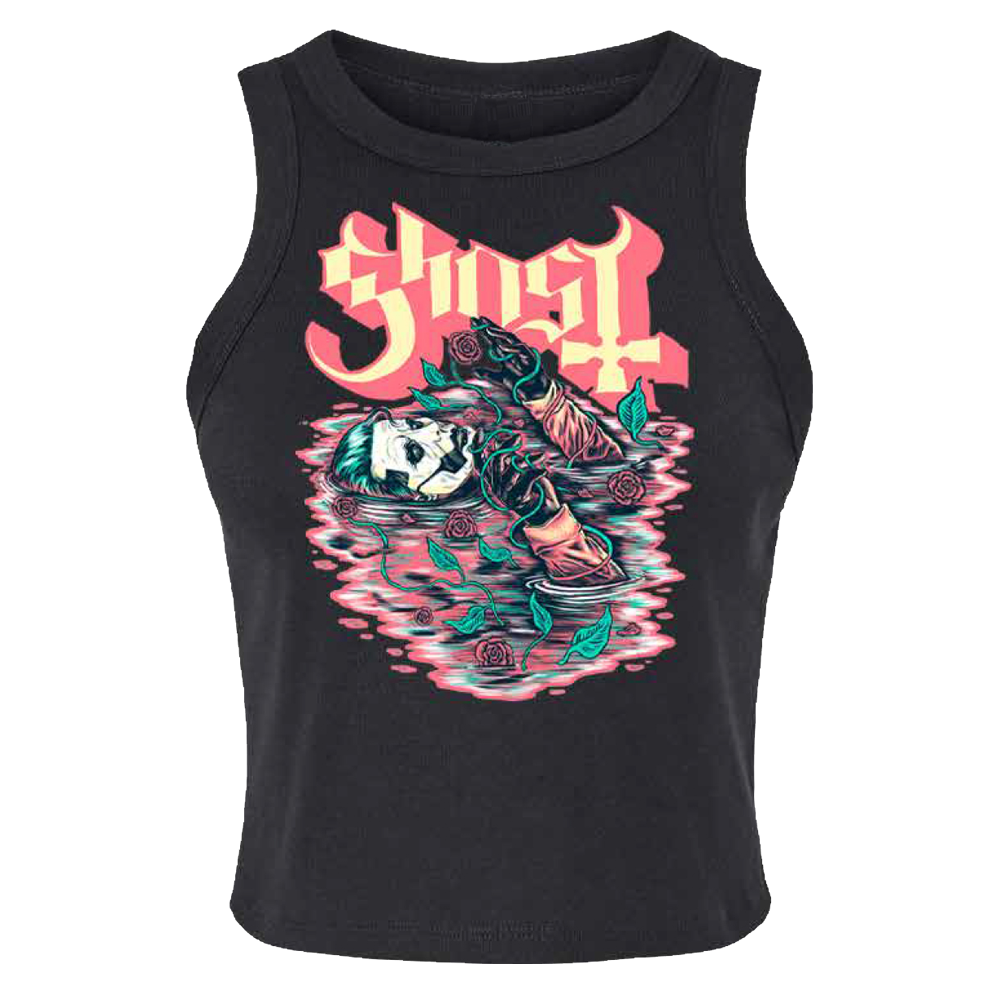 Pre-Raphaelite tank top features colorful artwork of Papa Emeritus IV surrounded by roses and water.