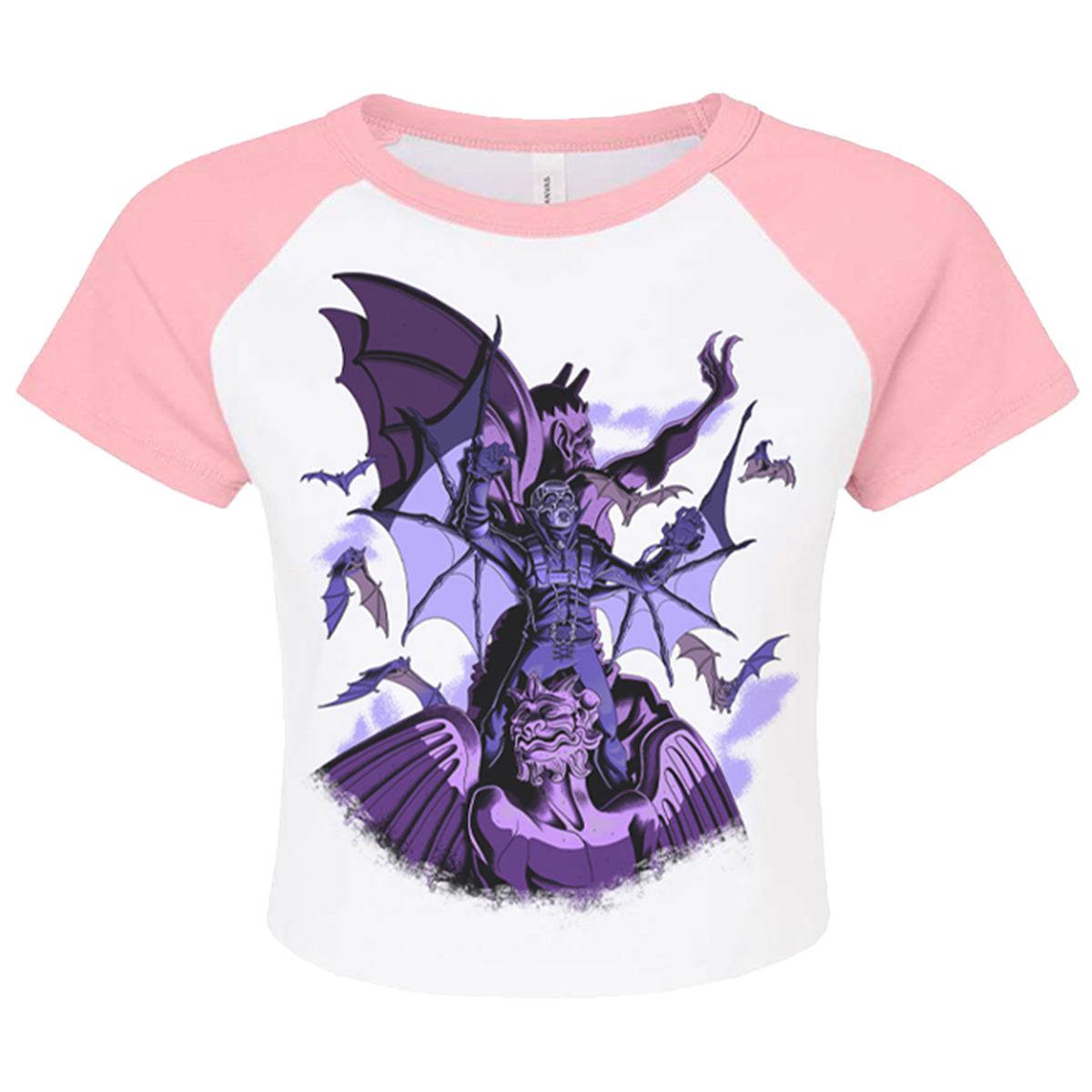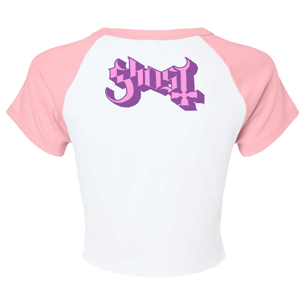 The Ghost Gargoyle Baby Raglan Tee is a cropped, fitted ringer style in soft pink and white. Featuring a bold purple graphic of Papa V commanding winged gargoyles across the front, this tee captures a perfect mix of playful and sinister. Finished with pink contrast sleeves and a Ghost logo print on the back for an extra touch of detail.