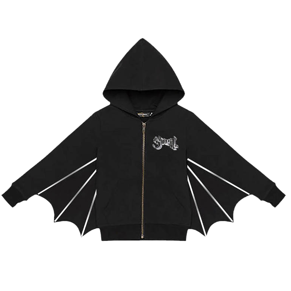 New Skeletá Batwing Hoodie—designed to celebrate the launch of Ghost’s Skeletá album and the 2025 World Tour. This limited-edition zip-up features stitched winged panels under each sleeve, giving it a striking silhouette.